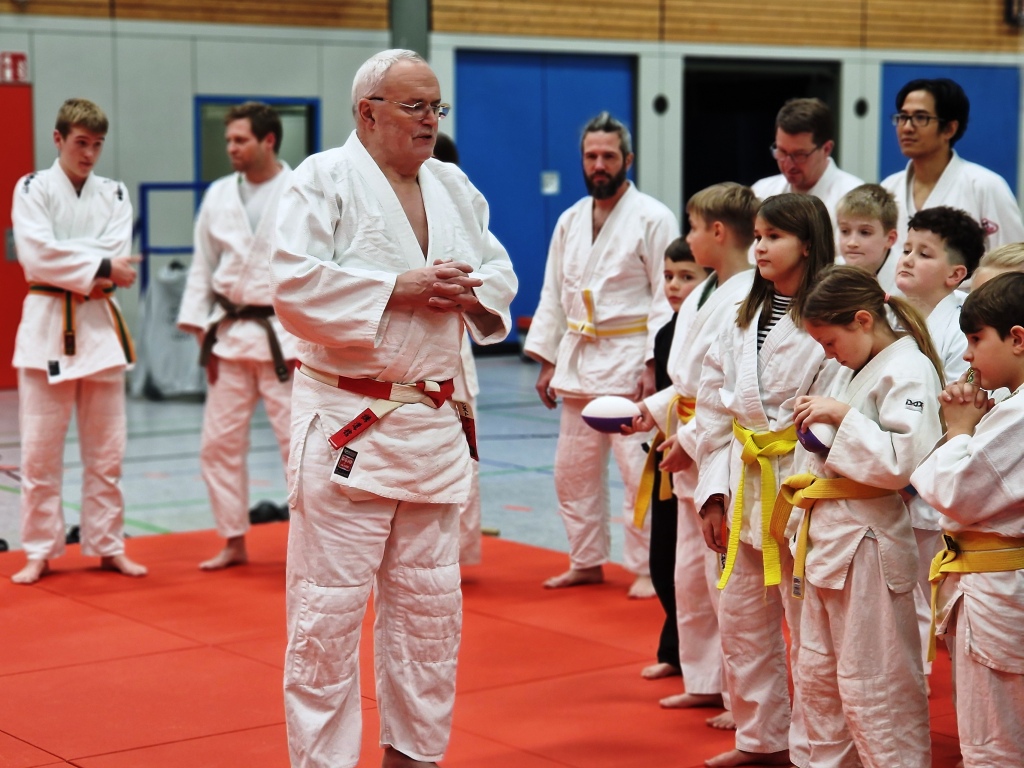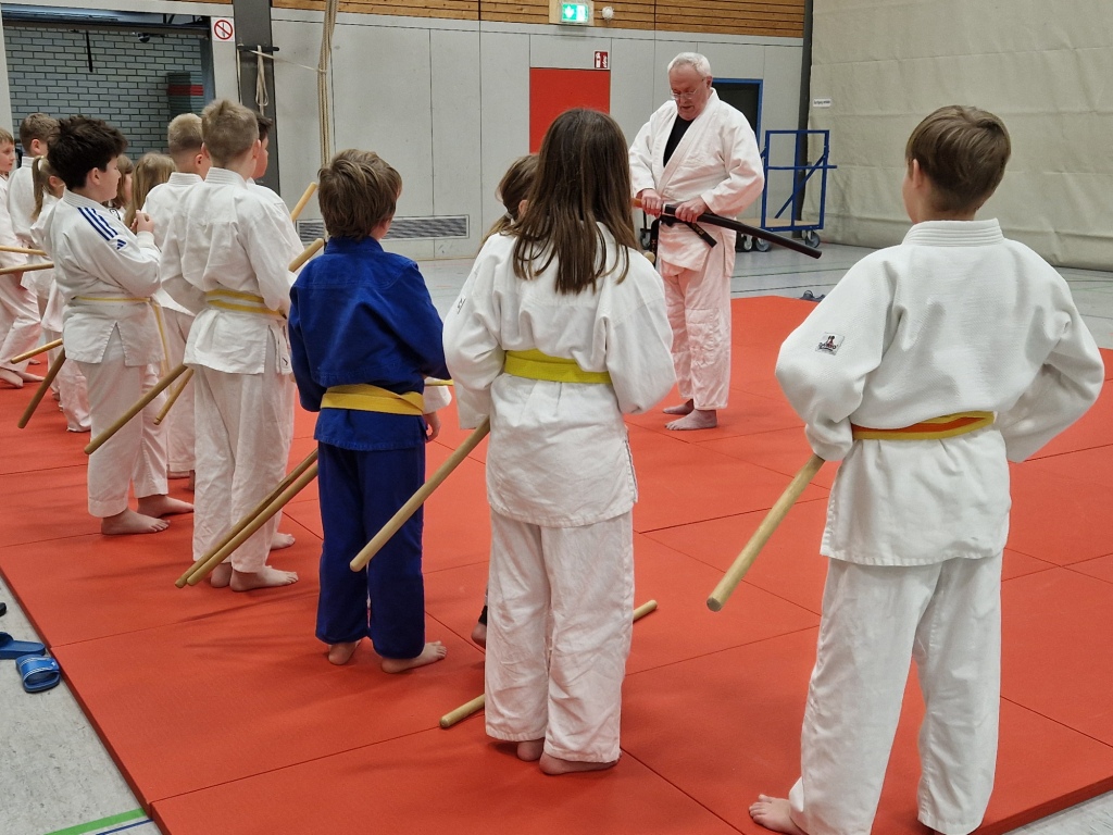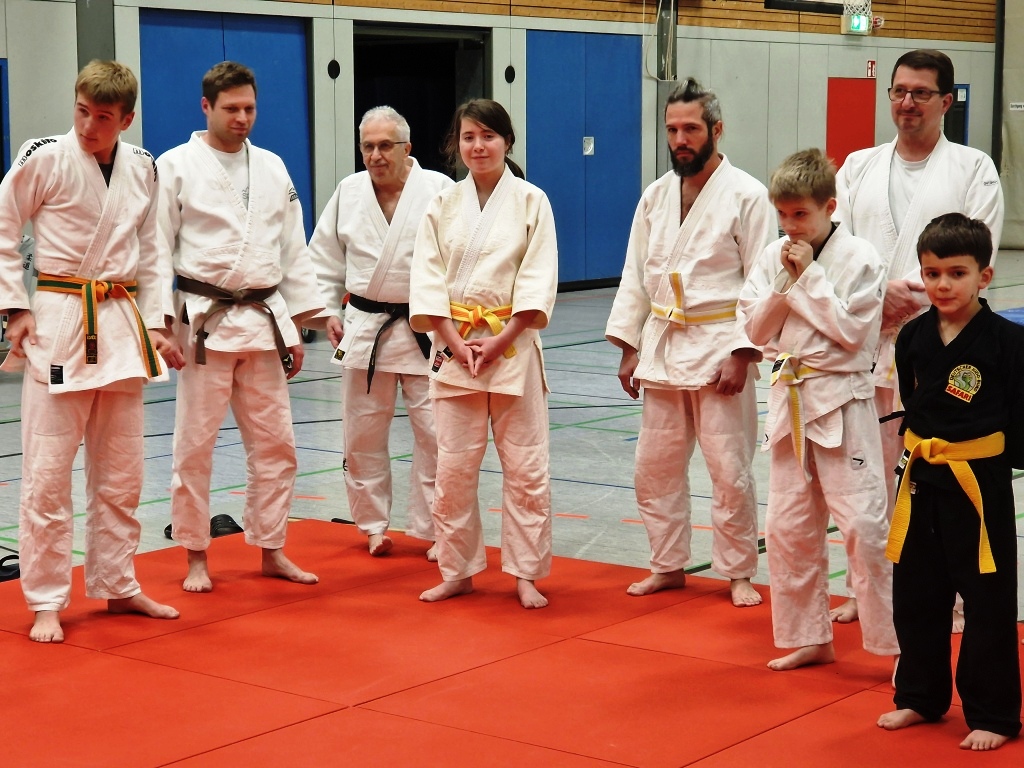 Die Judoka der Sportfreunde Montabaur Aktiv e. V. luden beim letzten Training vor der Weihnachtspause alle Eltern und weitere Interessierte zu einem kontrastreichen und spannenden Training der besonderen Art ein. Nach dem gemeinsamen Mattenaufbau und dem Herrichten des reichhaltigen Buffets fand das traditionelle Angrüßen im Dojo statt, nach dem der erste Vorsitzende Ernst Elenz (6. Dan, rot-weißer Gürtel) alle Gäste herzlich willkommen hieß und durch den weiteren Abend führte. Nach einem judospezifischen Aufwärmen im Plenum aller Judoka zeigten die jugendlichen Sportlerinnen und Sportler aus der Montags- und Mittwochsgruppe unterschiedliche Techniken aus ihrem Übungsprogramm, dann demonstrierte Uli Marx (1. Dan, schwarzer Gürtel) verschiedene Formen der Handhabung des japanischen Schwertes – Katana – aus dem Iaido, die Ernst Elenz erklärend kommentierte.